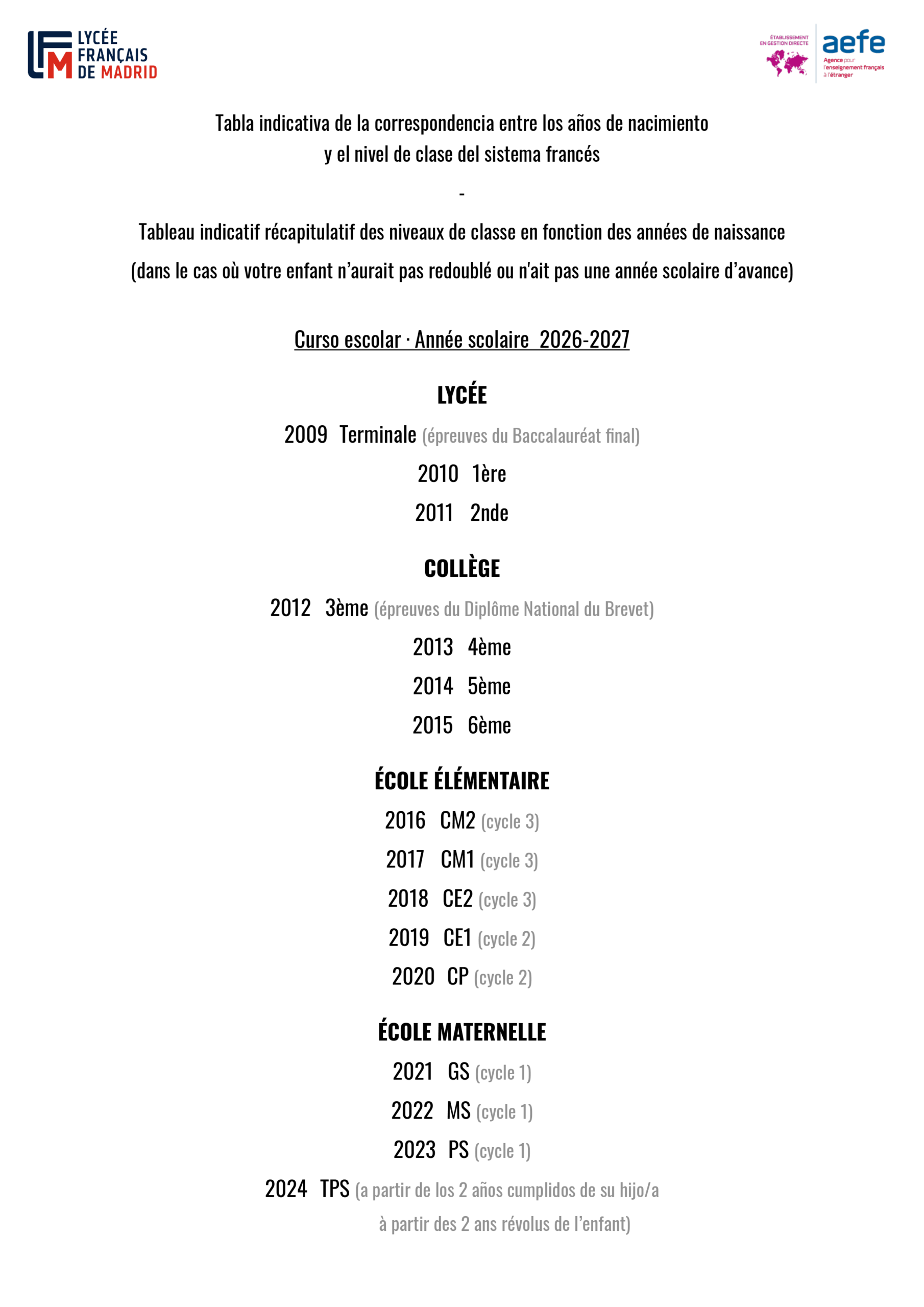 En cas de problème technique durant la procédure, envoyer un message à assistance@lfmadrid.org. Merci de mettre comme objet du message « Inscriptions 2026/2027 » ou « Inscriptions 2025/2026 » et de donner le plus de détails possible sur les difficultés rencontrées. Nous vous répondrons dans les plus brefs délais.