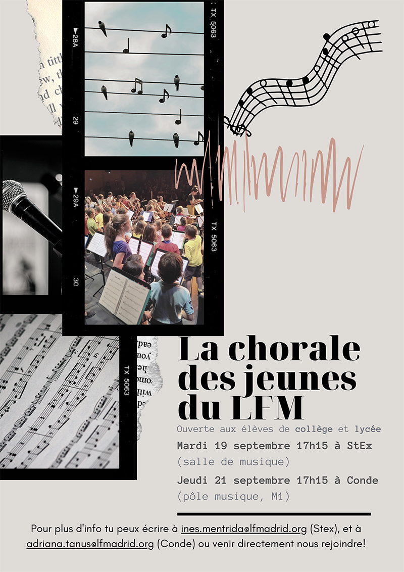 • Chorale : l’activité dirigée par Adriana Tanus, professeur d’éducation musicale au LFM, se fait chaque jeudi de 17h15 à 19h15 dans le pôle musique, salle M1.